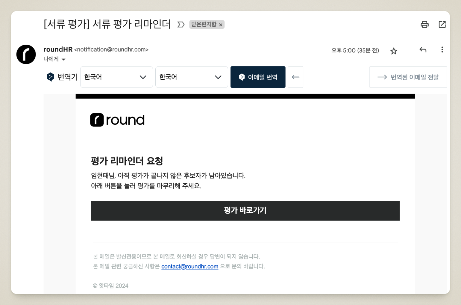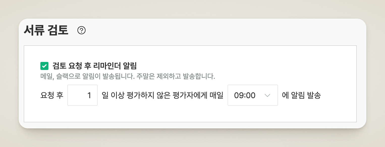 **평가 자동 리마인드**를 설정하면 서류 검토 요청 후 일정 기간 내에 평가를 완료하지 않은 평가자에게 자동으로 리마인더 메일을 발송합니다. 평가 지연을 방지하고 채용 프로세스의 속도를 유지하는 데 효과적입니다.