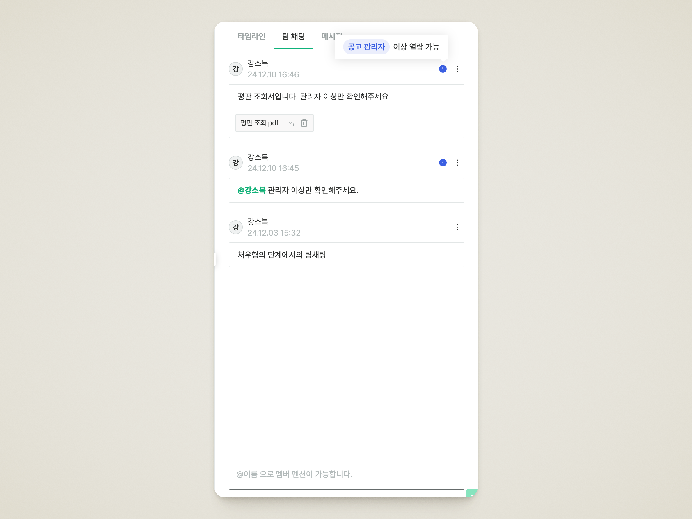 채팅 작성 시 열람 권한을 설정할 수 있습니다. 특정 멤버만 해당 메시지를 확인할 수 있도록 제한하여 민감한 논의를 안전하게 관리할 수 있습니다.