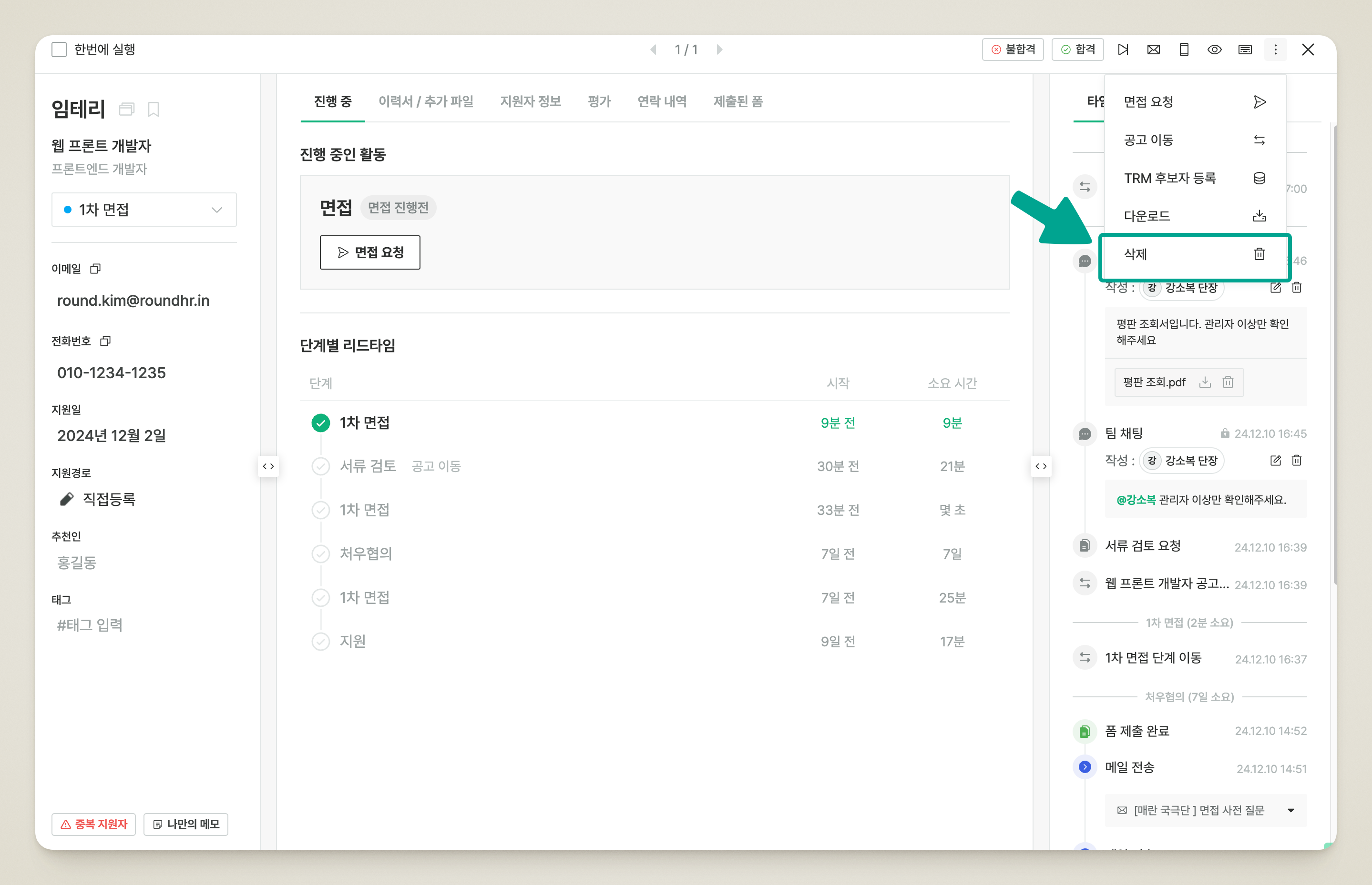 * 지원자 프로필 내 오른쪽 상단 \[더보기] 버튼을 클릭한 후 \[삭제]를 클릭합니다.