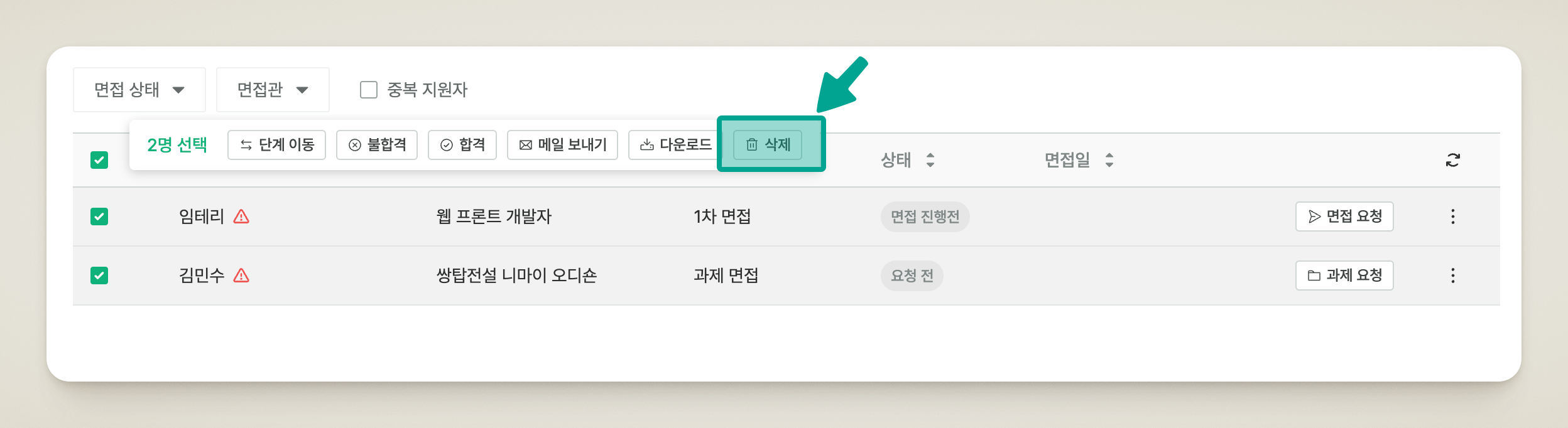 * 삭제할 지원자를 선택한 후 상단 \[삭제]를 클릭합니다.