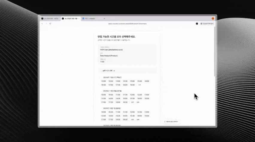면접관이 "다음 주 월요일 오전과 수요일 오후 2시 이후 가능해요"와 같이 자연스럽게 입력하면, AI가 자동으로 정확한 시간대로 변환해줍니다.