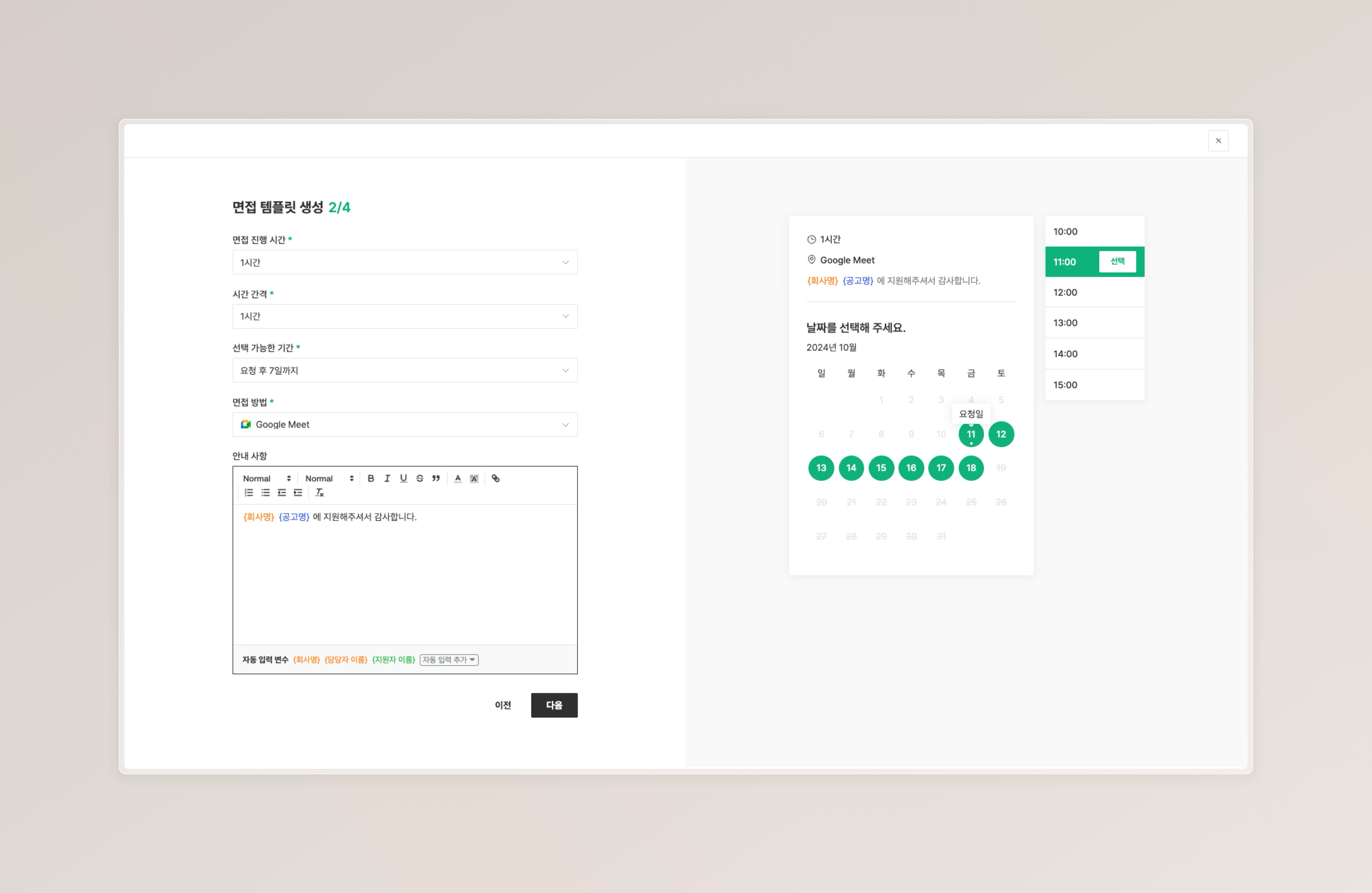 * **선택 가능한 기간** : 지원자가 특정 기간 내에서만 면접일을 선택할 수 있도록 설정합니다.