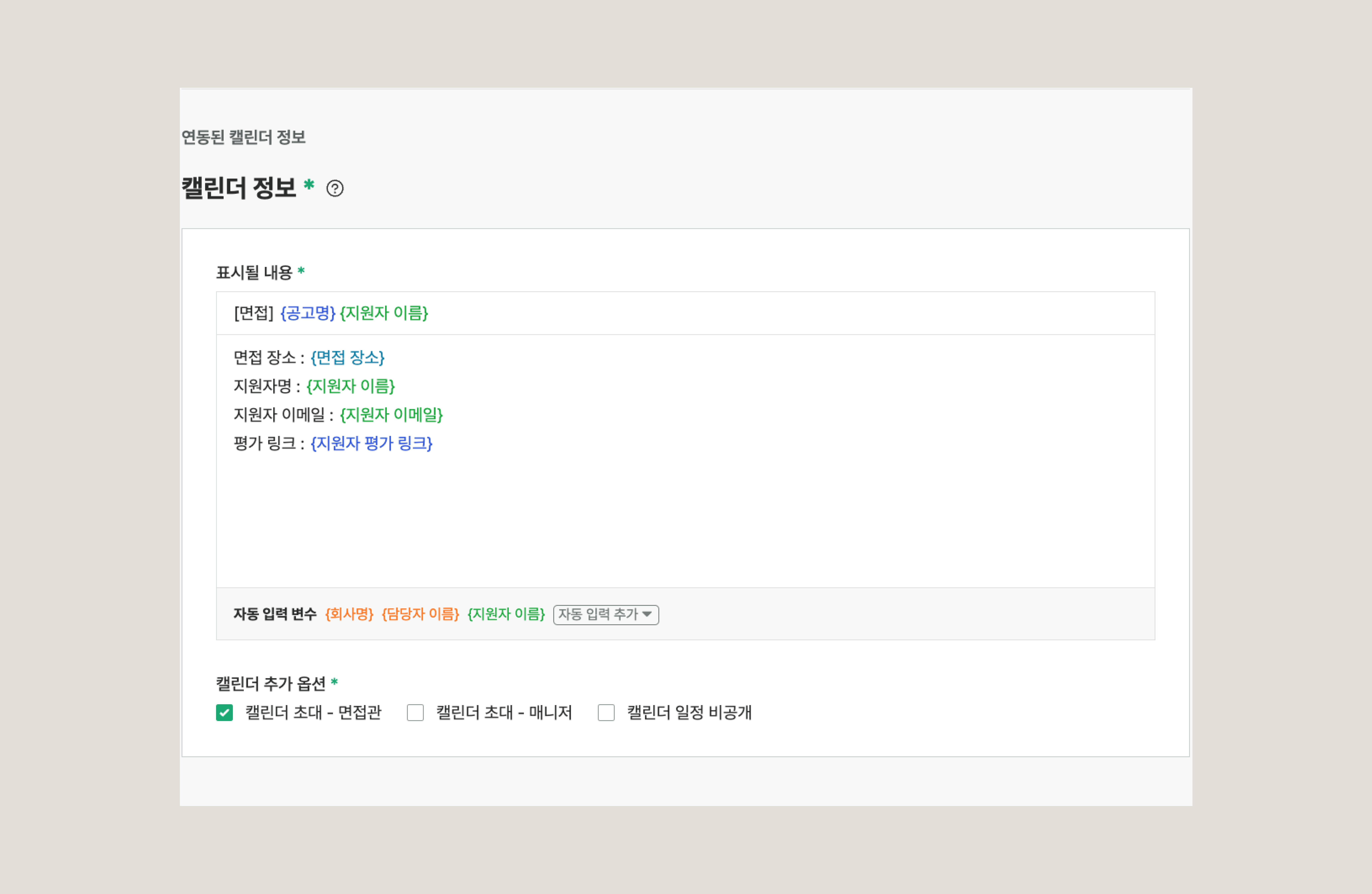 * 캘린더 초대를 설정하시면 해당 담당자의 캘린더에 면접 일정을 자동으로 저장합니다.