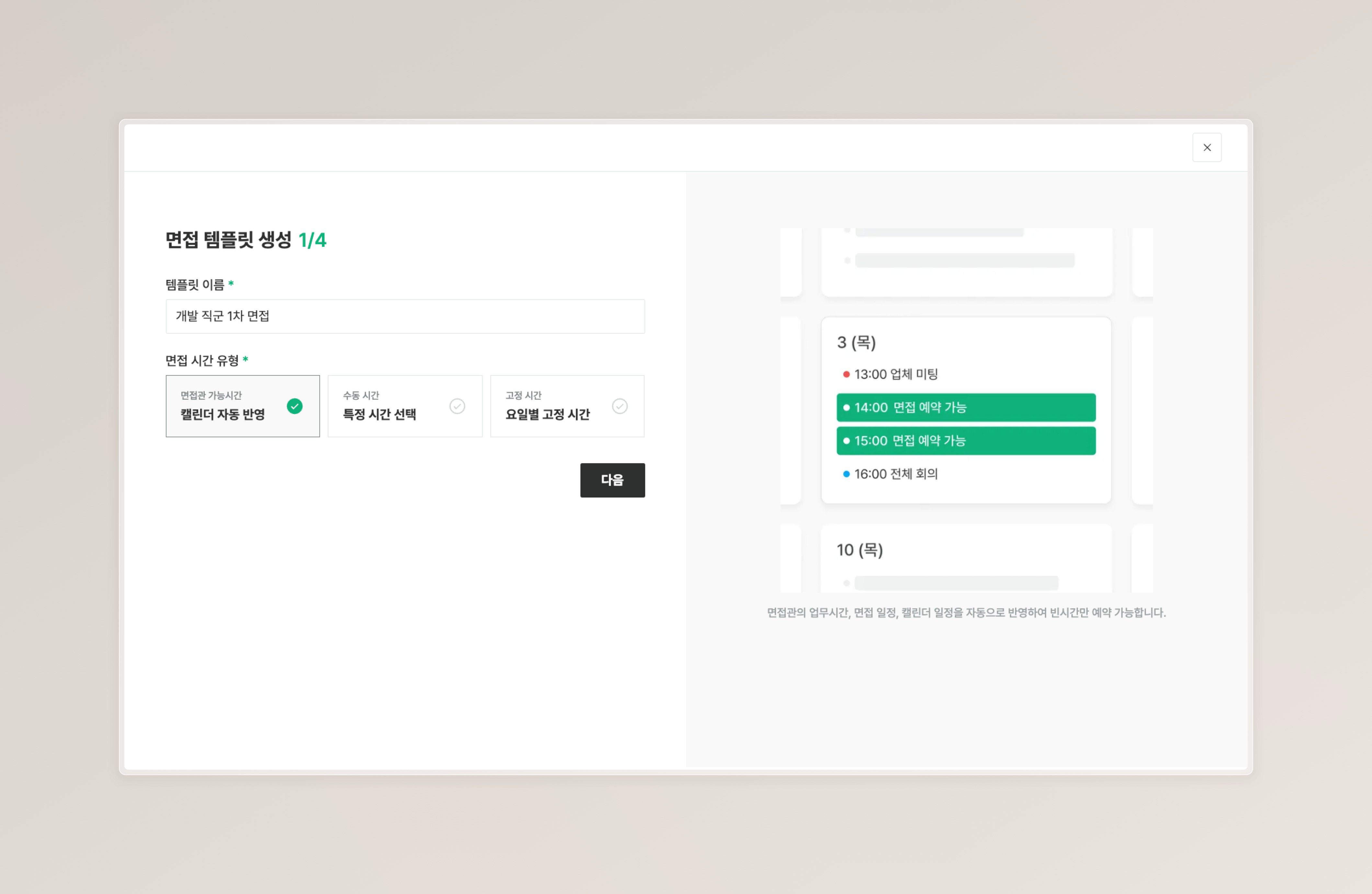 * 면접관의 업무시간, 면접 일정, 캘린더 일정을 자동으로 반영하여 빈 시간만 예약할 수 있습니다.