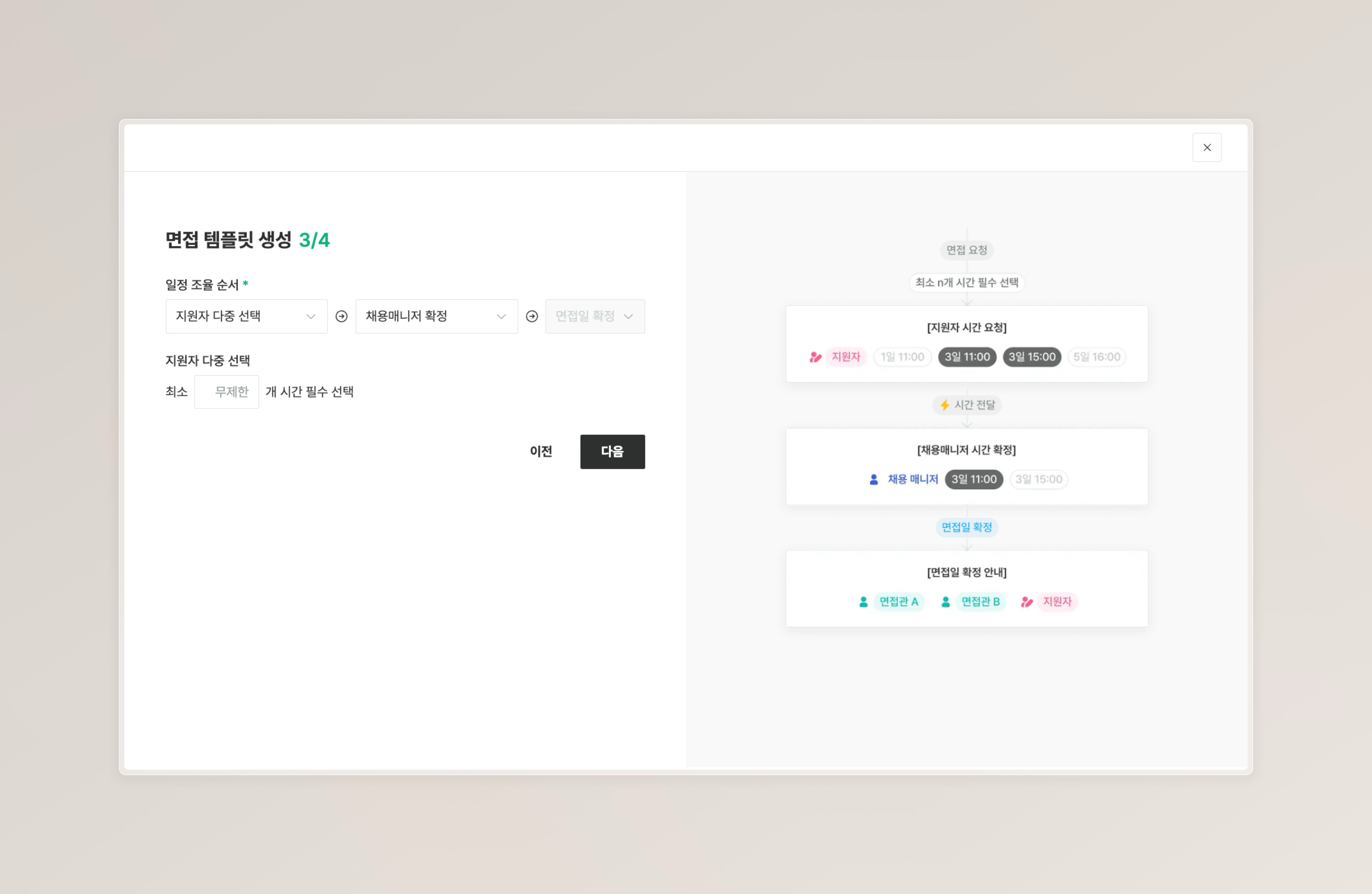 * **지원자 다중 선택** : 지원자가 최소 N개의 시간을 선택하면 채용 매니저가 최종 면접일을 확정합니다.\\