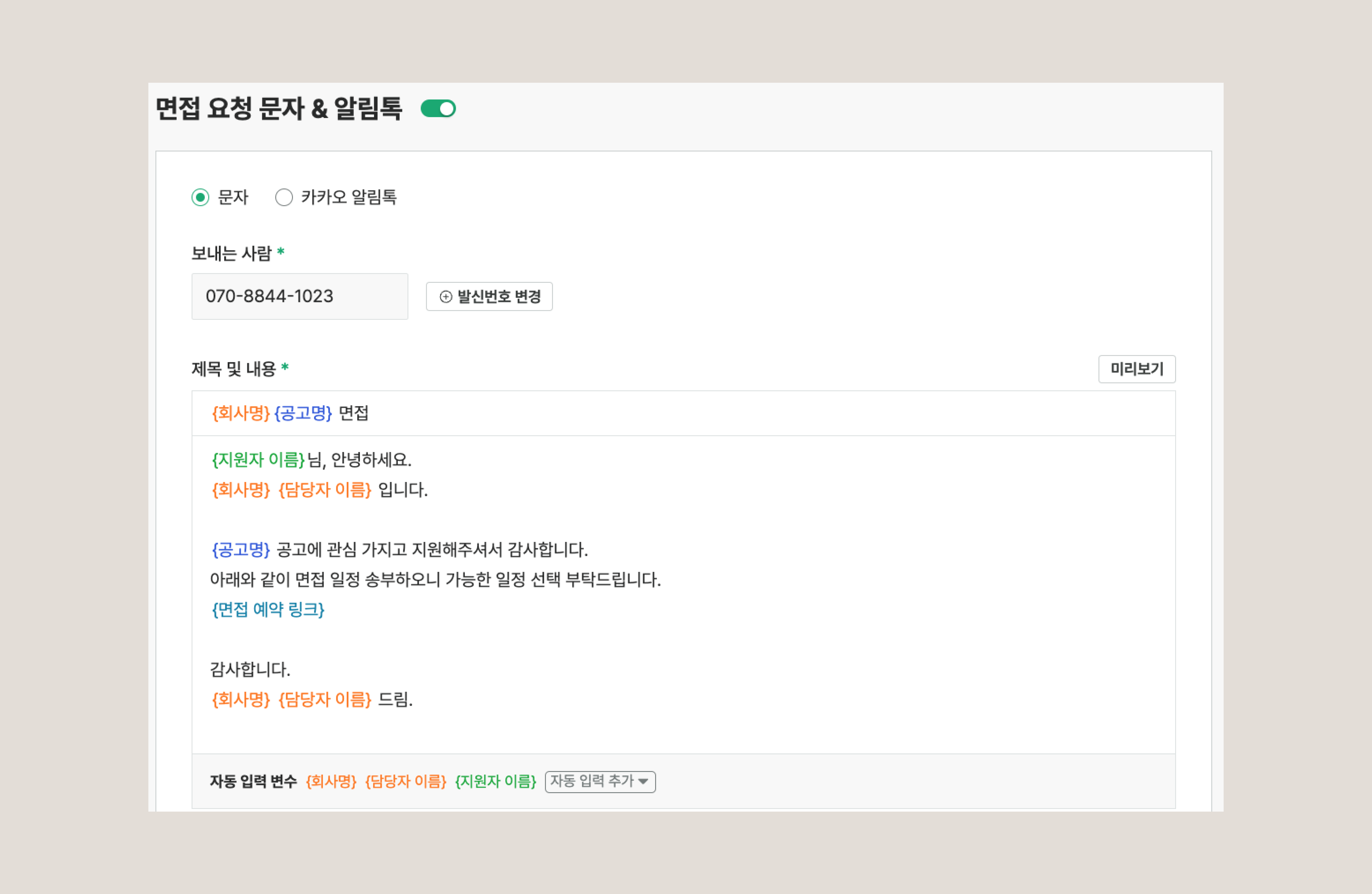 * 면접 요청 시, 메일과 함께 문자 또는 알림톡을 보낼 수 있습니다.