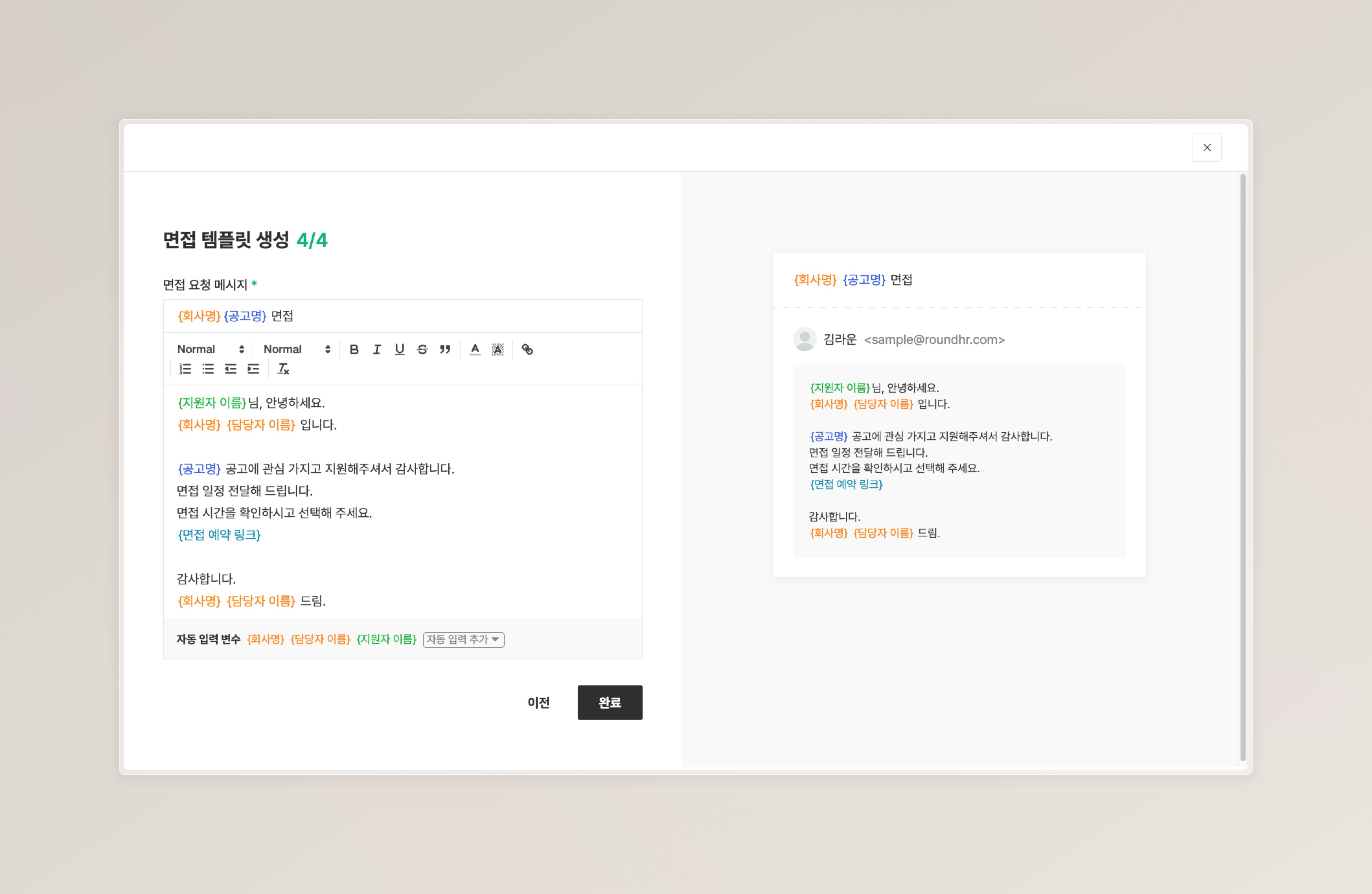 면접 요청 메일에는 **반드시&#x20;**<mark style="color:blue;">**{면접 예약 링크}**</mark>**가 포함**되어야 합니다.