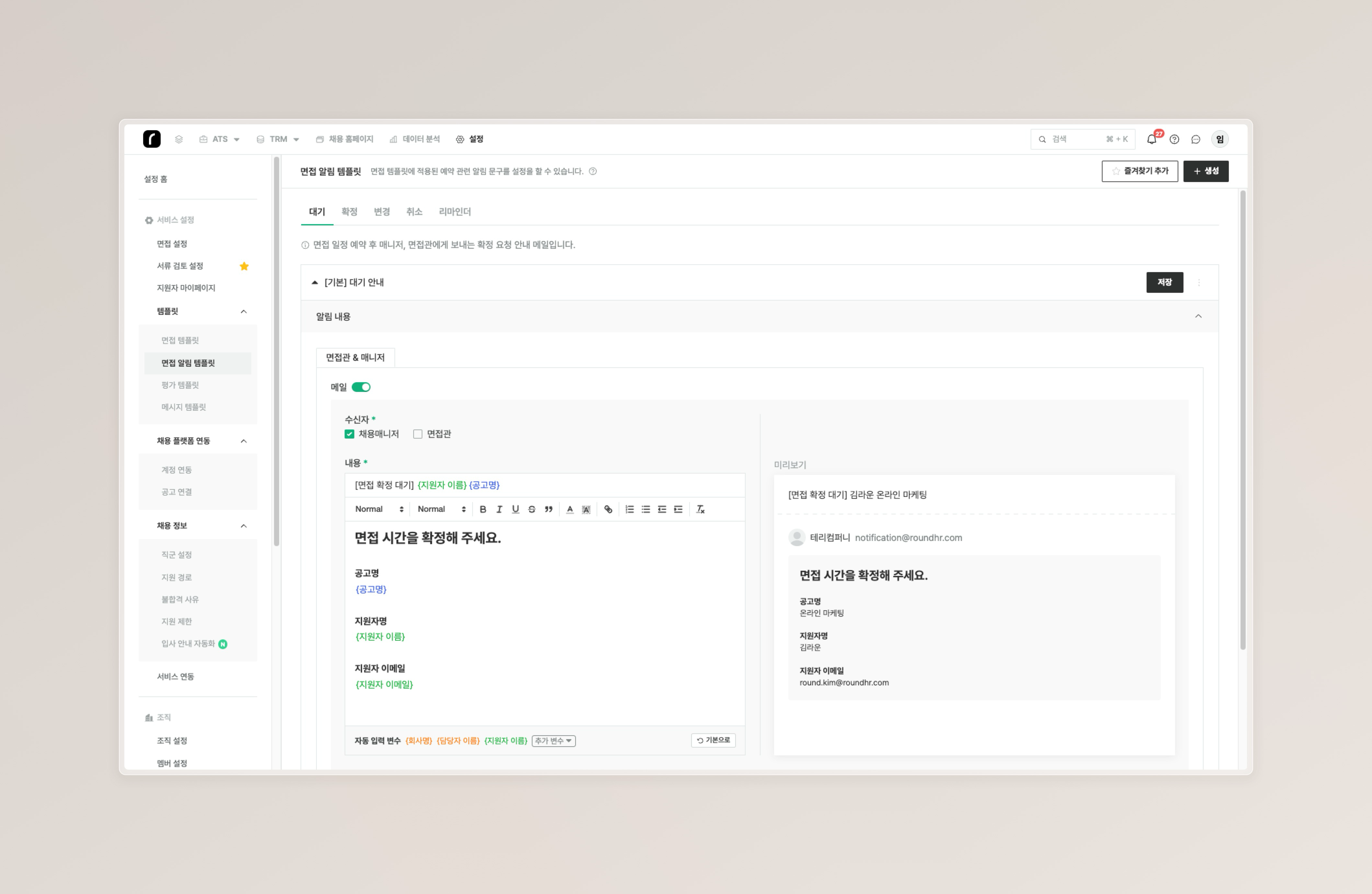 1. 설정 > 템플릿 > 면접 알림 템플릿을 선택합니다.