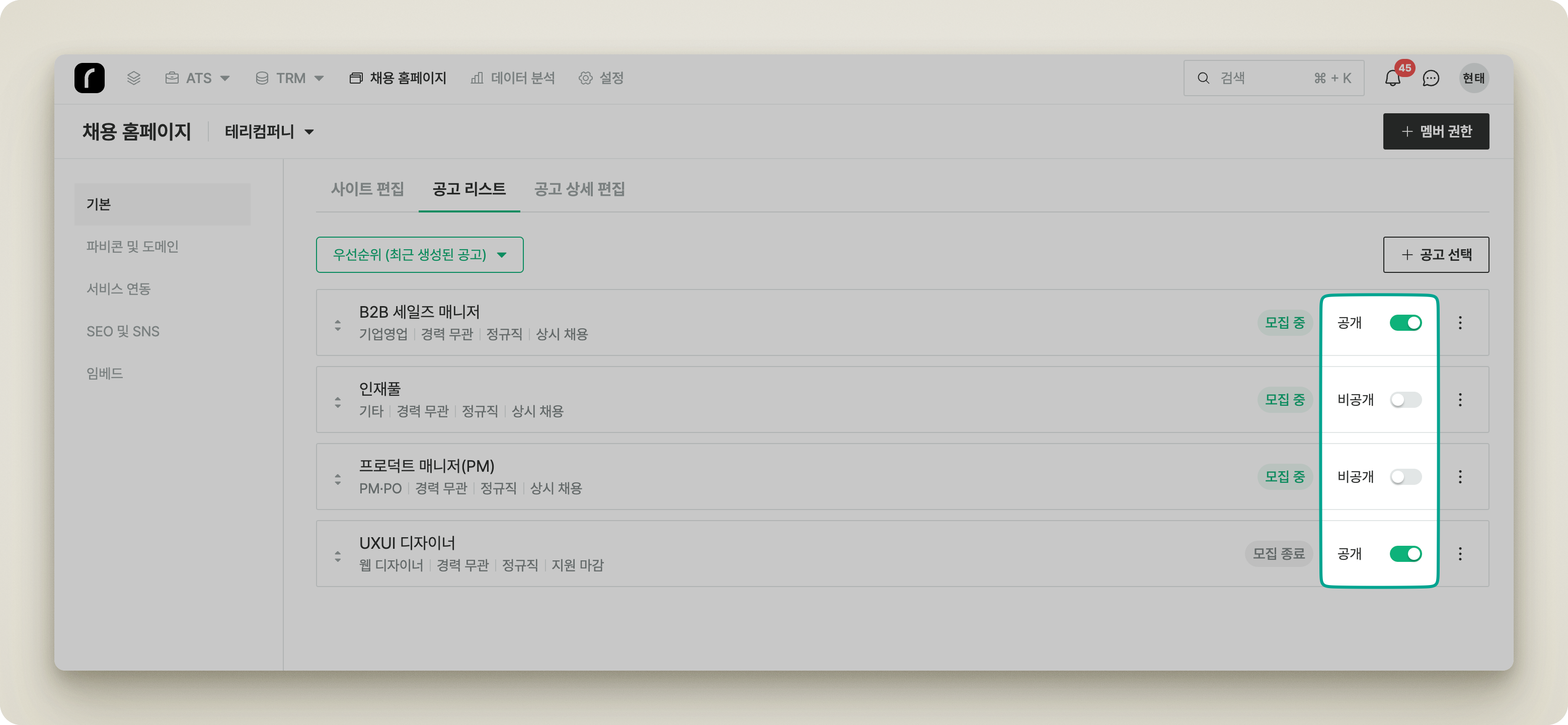 채용 공고의 **공개** 또는 **비공개** 상태를 설정합니다.