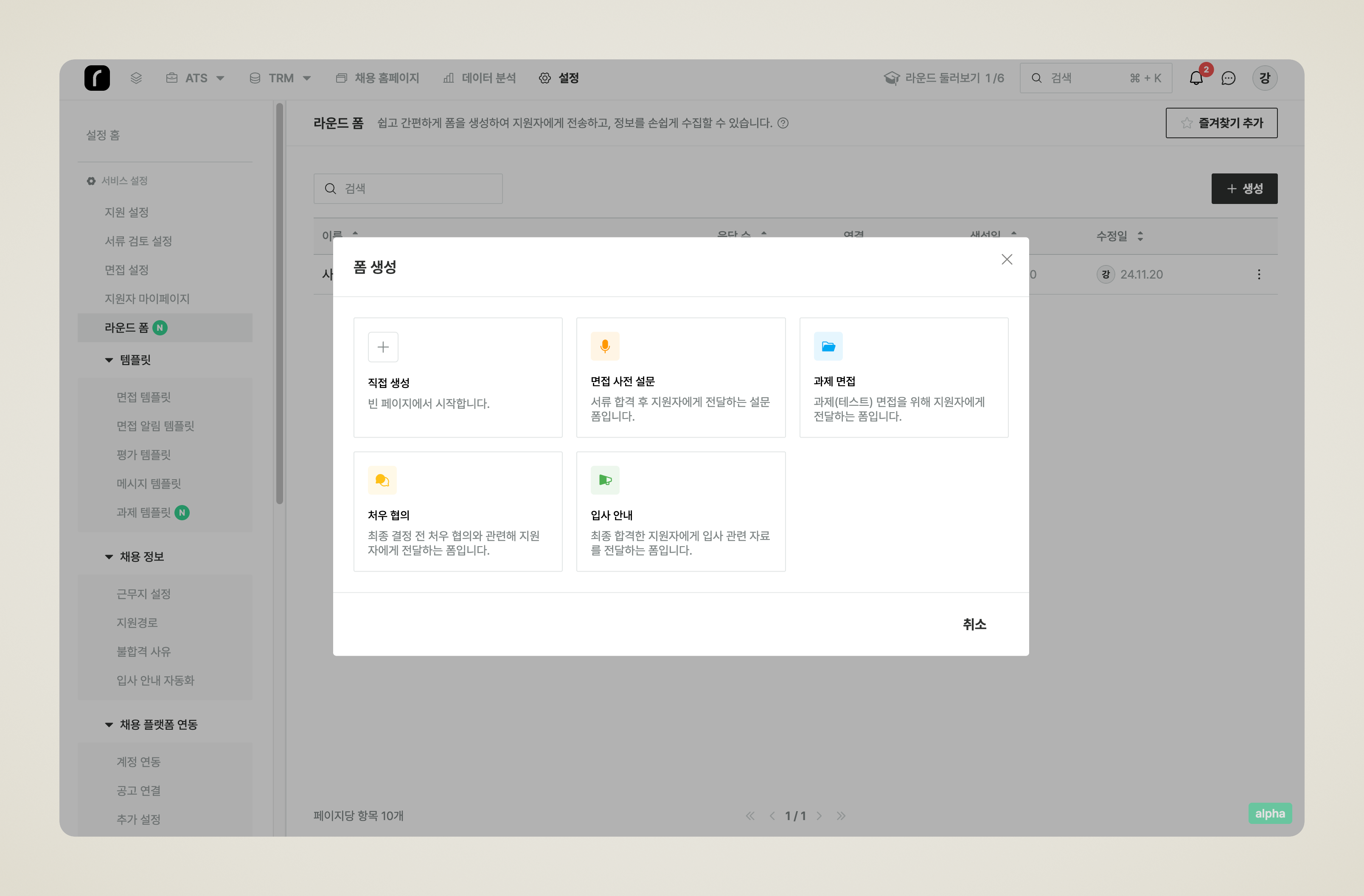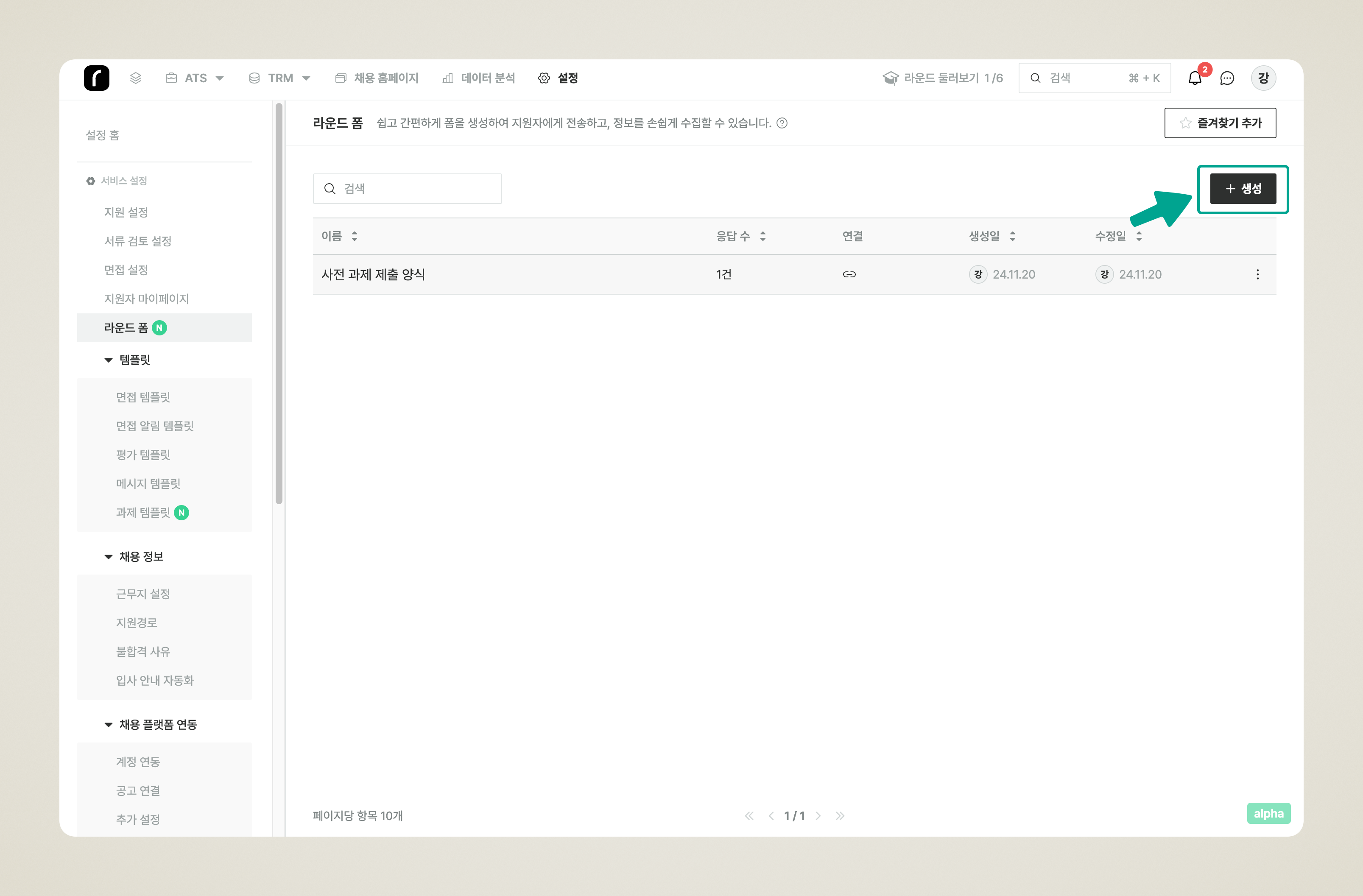 * **설정** > **라운드폼**에서 우측 상단 `[+생성]`을 클릭합니다.