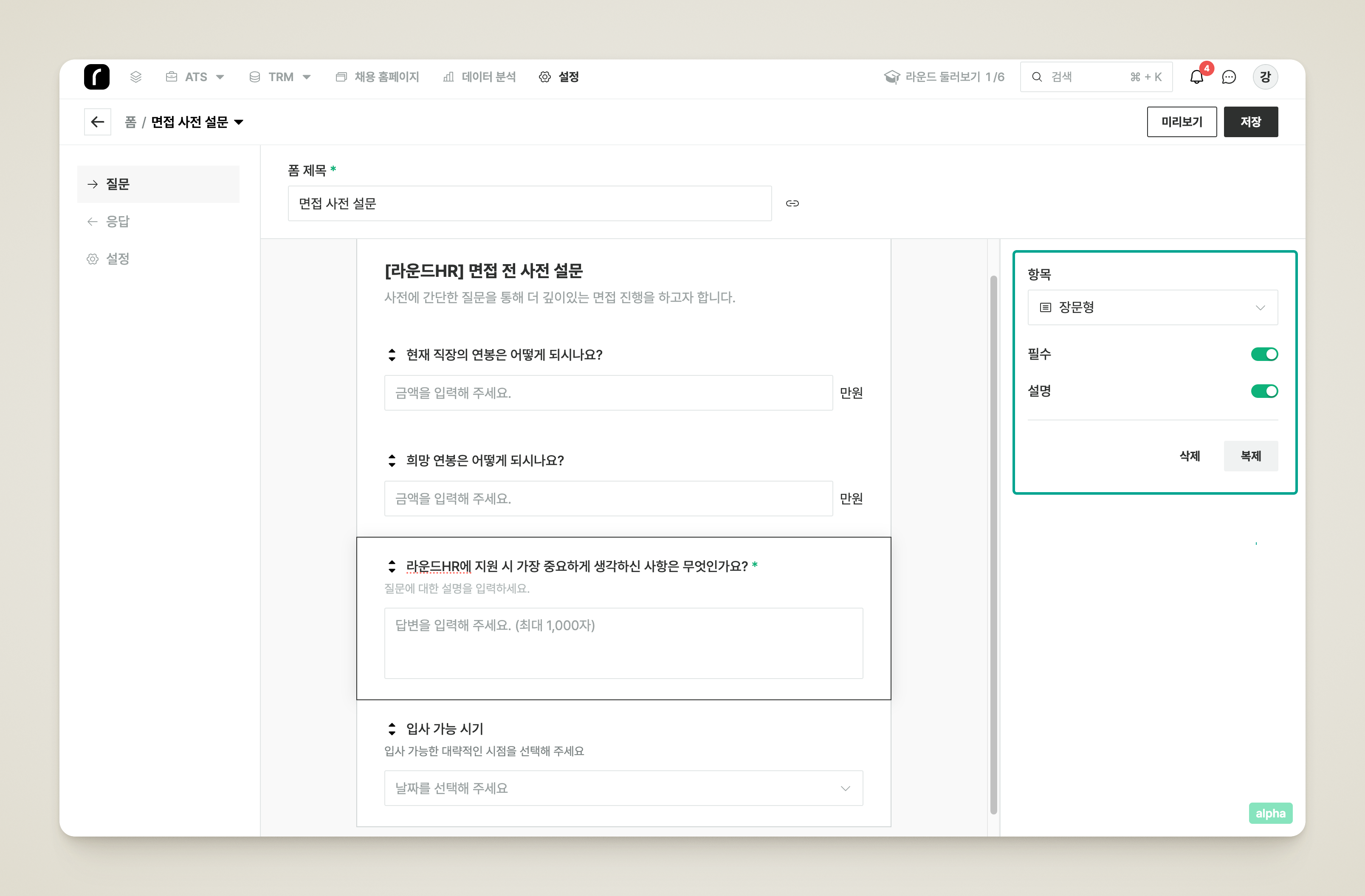 * **다양한 항목:** 단답형, 장문형, 척도, 별점, 연봉 등 17가지 항목 유형을 지원합니다.