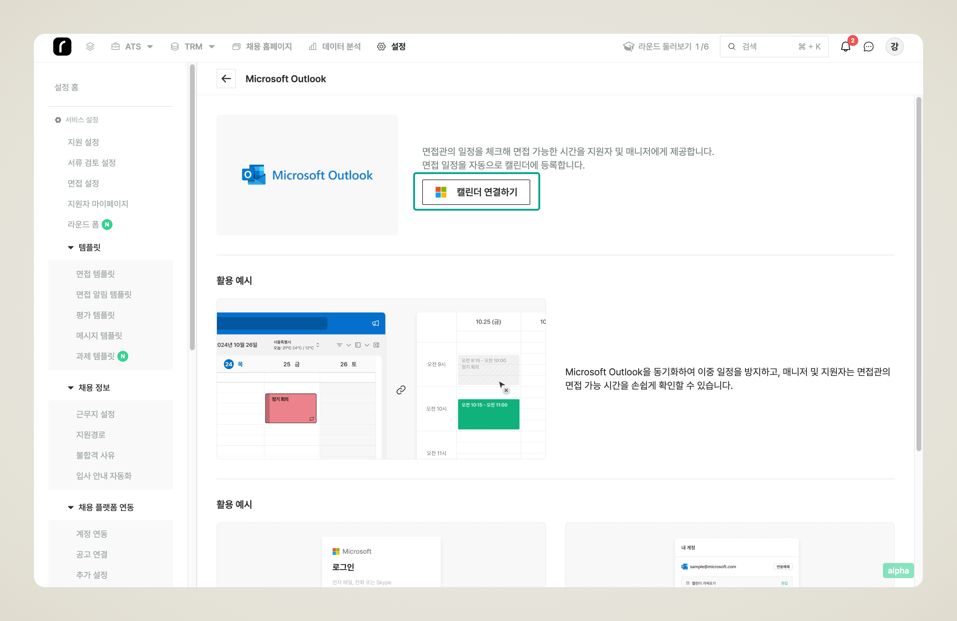 Microsoft Outlook 캘린더를 연동하면 면접관의 기존 일정과 겹치지 않는 시간을 자동으로 파악하여 면접 일정을 조율합니다. Microsoft 365 환경을 사용하는 조직에 적합합니다.