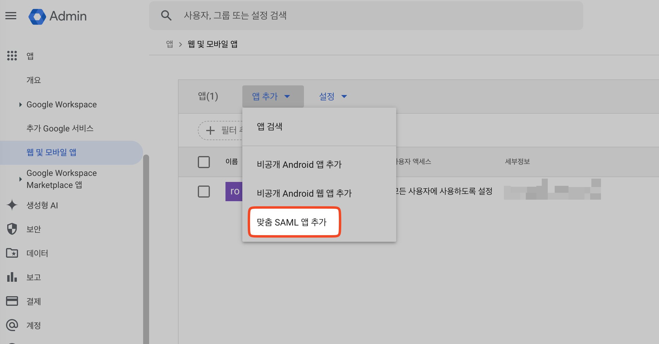 * 구글 관리 콘솔 > [웹 및 모바일 앱 이동](https://admin.google.com/ac/apps/unified)